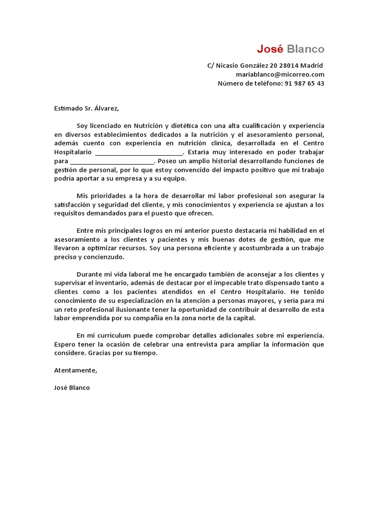 Ejemplo De Carta De Presentacion Para Hosteleria