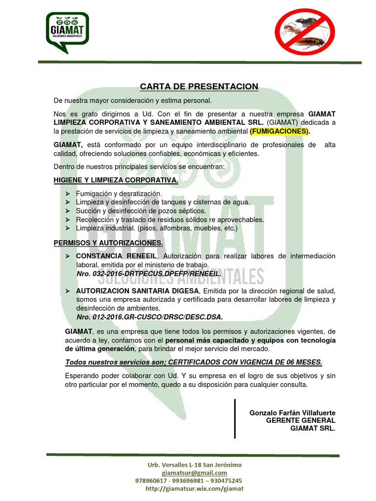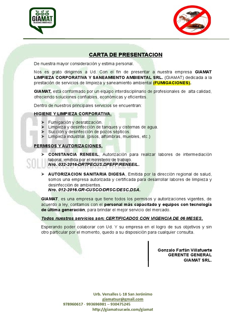 Tenemos un aval de mas de 19 aos de experiencia en control de plagas mantenimientolimpiezaremodelacionconstruccion y decoracion solo necesitamos saber su problema para solucionarselo. No olvides que debes usar un lenguaje formal ser muy respetuoso y detallar de una manera clara. Una de las herramientas ms eficaces al momento de dar a conocer tu empresa es redactar una misiva de presentacin la cual debers enviar a todos sus posibles clientes para que conozcan que tu empresa es nueva en el mercado y que tiene los productos y servicios que ellos buscan al mejor precio.
