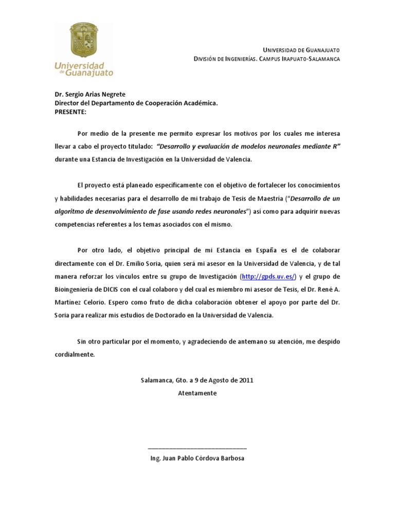 La carta de presentaci acompanya al teu currculum i serveix per cridar latenci de lempresa. Presentar una carta compromiso dirigida al Comit Acadmico con la exposicin de motivos para ingresar al plan de estudios de la Maestra de su inters donde exprese su aceptacin del Programa y manifieste su disposicin a cumplir con las actividades acadmicas que le sean asignadas. Presentar el anteproyecto de investigacin.
