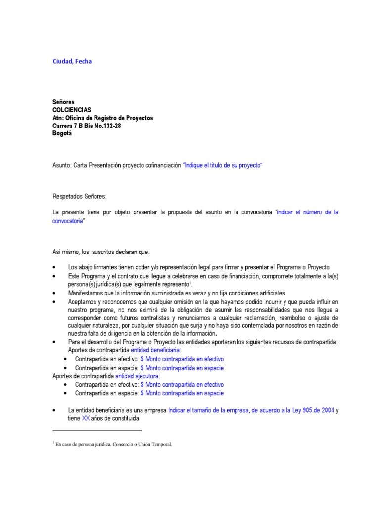 Modelo Carta Presentacion Proyecto Cofinanciacion