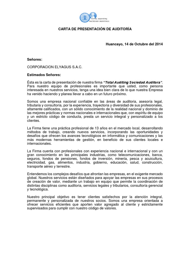Carta De Presentacion De Auditoria Normas Internacionales De Informacion Financiera Negocios