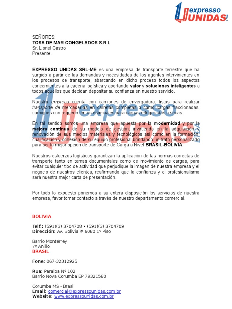 Carta de presentacion de una empresa de servicios de transporte de carga. Acople y desacople del remolque. Desde hace aos he ejercido como abogado consultor economista para distintas empresas se puede hacer una pequea relacin de.