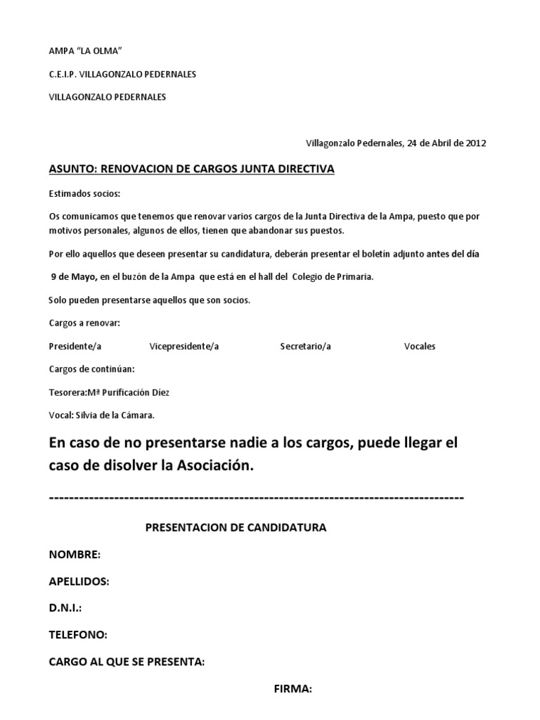 Modelo de carta de presentacion de junta directiva. Los nuevos miembros de la junta llevamos disfrutando junto a vosotros al mximo de nuestro querido pueblo ao tras ao desde que nacimos y no cabe duda de que ya es hora de agradecer y compensar de alguna manera todo lo que en l hemos vivido a travs de la implicacin en las. Para la Junta Directiva es un gran reto que asumimos con verdadera ilusin y honor. Mximo de vocales que pueden ser nombrados.
